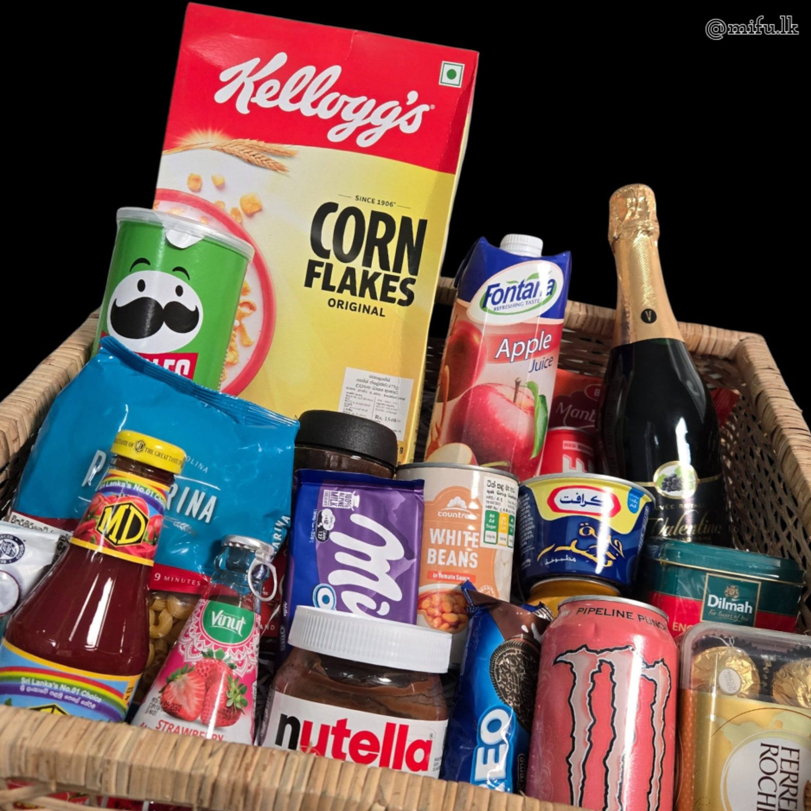 Corn Flakes X 1 , Grape sparkling drink X 1 , Pringles (L) X 1 , Fontana apple 1l X 1 , Kraft cheese X 1 , Milka X  , Monster , ferror rocher 16 , Nescafe (L) , Dilmah tea , nutella , md  ,bounty , oreo , beans ,pasta basil drink